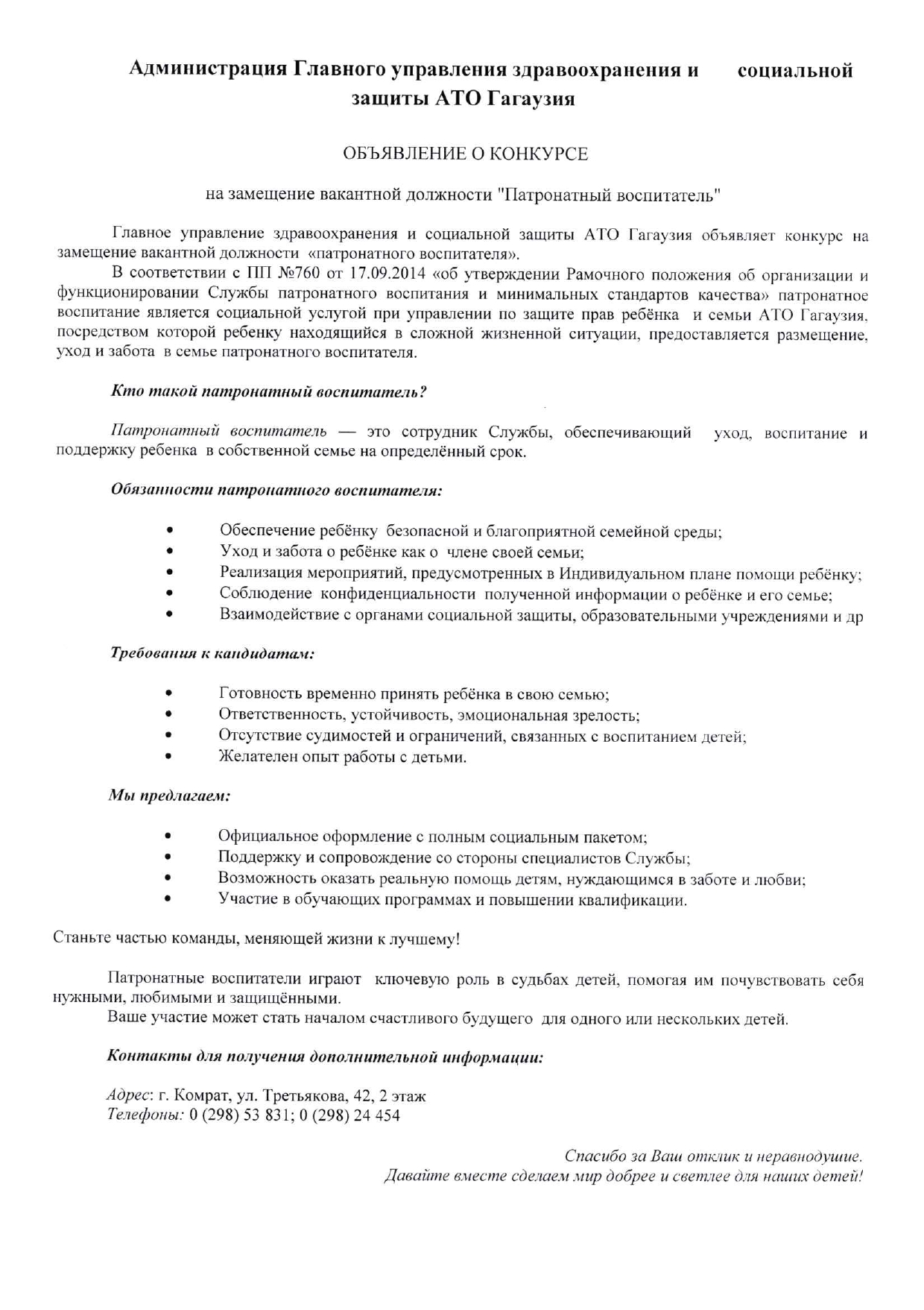 Главное управление здравоохранения и социальной защиты АТО Гагаузия объявляет конкурс на замещение вакантной должности "Патронатный воспитатель".