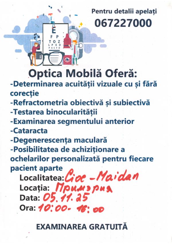 05.11.2025 года с 10:00 до 16:00 часов в зале для заседаний примэрии ждем всех желающих проверить свое зрение бесплатно.