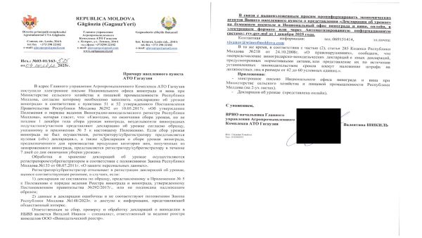 В адрес Главного управления Агропромышленного Комплекса АТО Гагаузия поступило электронное письмо Национального офиса винограда и вина при Министерстве сельского хозяйства и пищевой промышленности Республики Молдова, согласно которому необходимо заполнить «декларацию об урожае винограда» в соответствии с пунктами 51 и. 52 утвержденного Постановления Правительства Республики Молдова №292 от 10.05.2017г. «Об утверждении Положения о порядке ведения Виноградно-винодельческого регистра Республики Молдова», которая гласит, что: «Ежегодно, по окончании сбора урожая, но не позднее 1 декабря года сбора урожая винограда, возделыватели виноградных подучастков/участков представляют декларацию об урожае согласно образцу, указанному в приложении № 5 к настоящему Положению. Если сбор урожая винограда не был осуществлен, регистратору/субрегистратору представляется нулевая («0») декларация.», а также «Декларация о сборе урожая винограда, предназначенного для производства продукции категории вин, полученных из замороженного винограда, представляется регистратору/субрегистратору в течение 7 дней со дня окончания уборки урожая».
